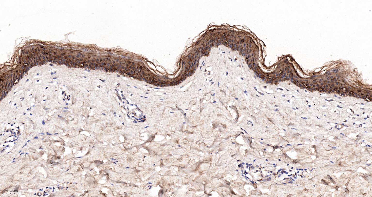 Paraformaldehyde-fixed, paraffin embedded Human Skin; Antigen retrieval by boiling in sodium citrate buffer (pH6.0) for 15 min; The section was incubated with Caspase 14 Monoclonal Antibody, Unconjugated (bsm-61356R) at 1:200 overnight at 4°C, followed by conjugation to the bs-0295G-HRP and DAB (C-0010) staining.