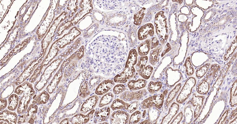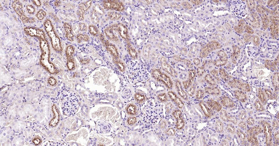 Paraformaldehyde-fixed, paraffin embedded Human Kidney; Antigen retrieval by boiling in sodium citrate buffer (pH6.0) for 15 min; Antibody incubation with Cystatin-C Monoclonal Antibody, Unconjugated(bsm-61363R) at 1:200 overnight at 4°C, followed by conjugation to the SP Kit (Rabbit, SP-0023)and DAB (C-0010) staining.