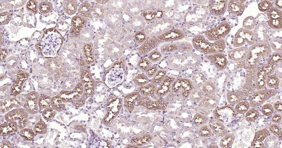 Paraformaldehyde-fixed, paraffin embedded Mouse Kidney; Antigen retrieval by boiling in sodium citrate buffer (pH6.0) for 15 min; Antibody incubation with Cystatin-C Monoclonal Antibody, Unconjugated(bsm-61363R) at 1:200 overnight at 4°C, followed by conjugation to the SP Kit (Rabbit, SP-0023)and DAB (C-0010) staining.