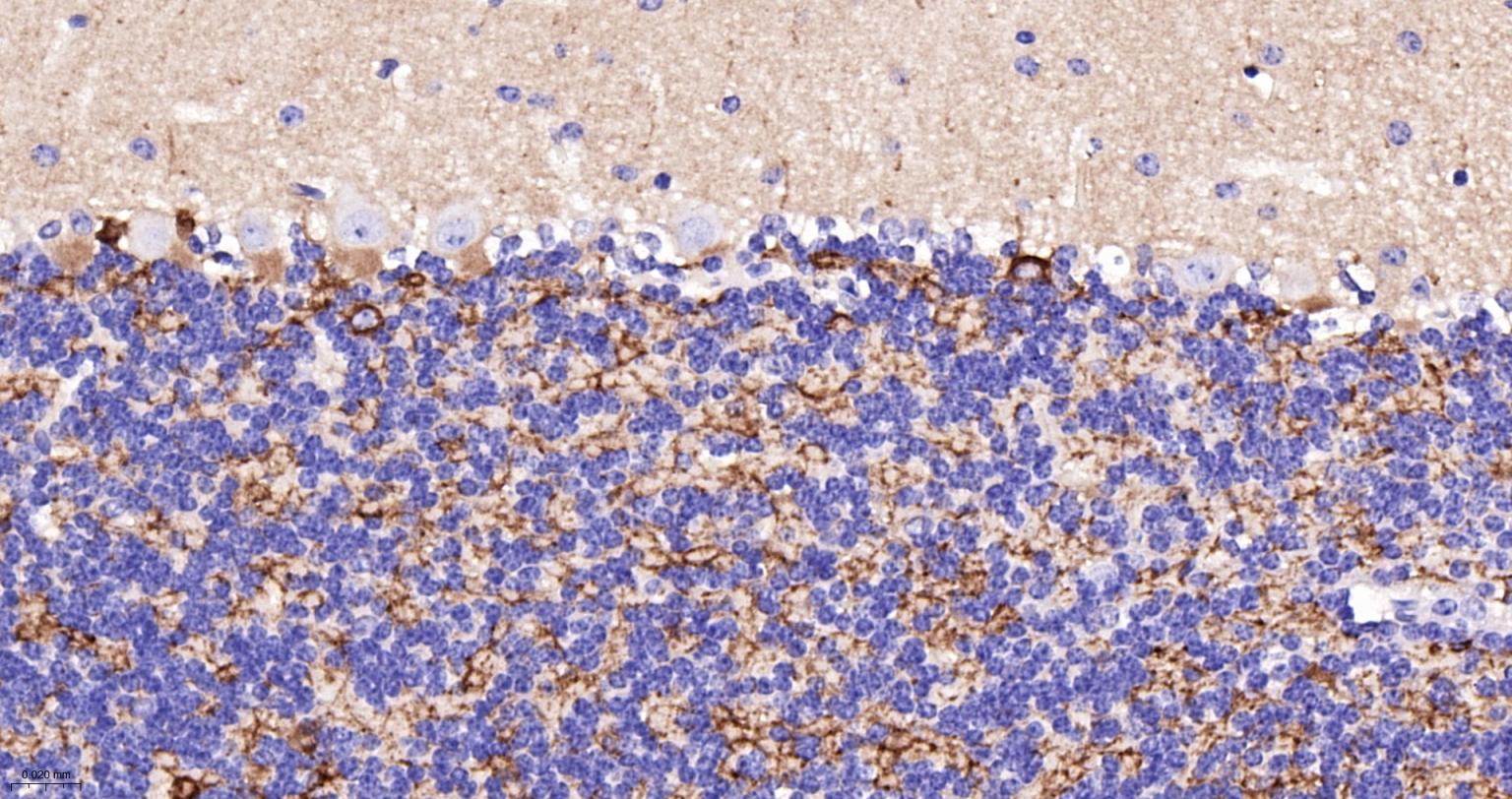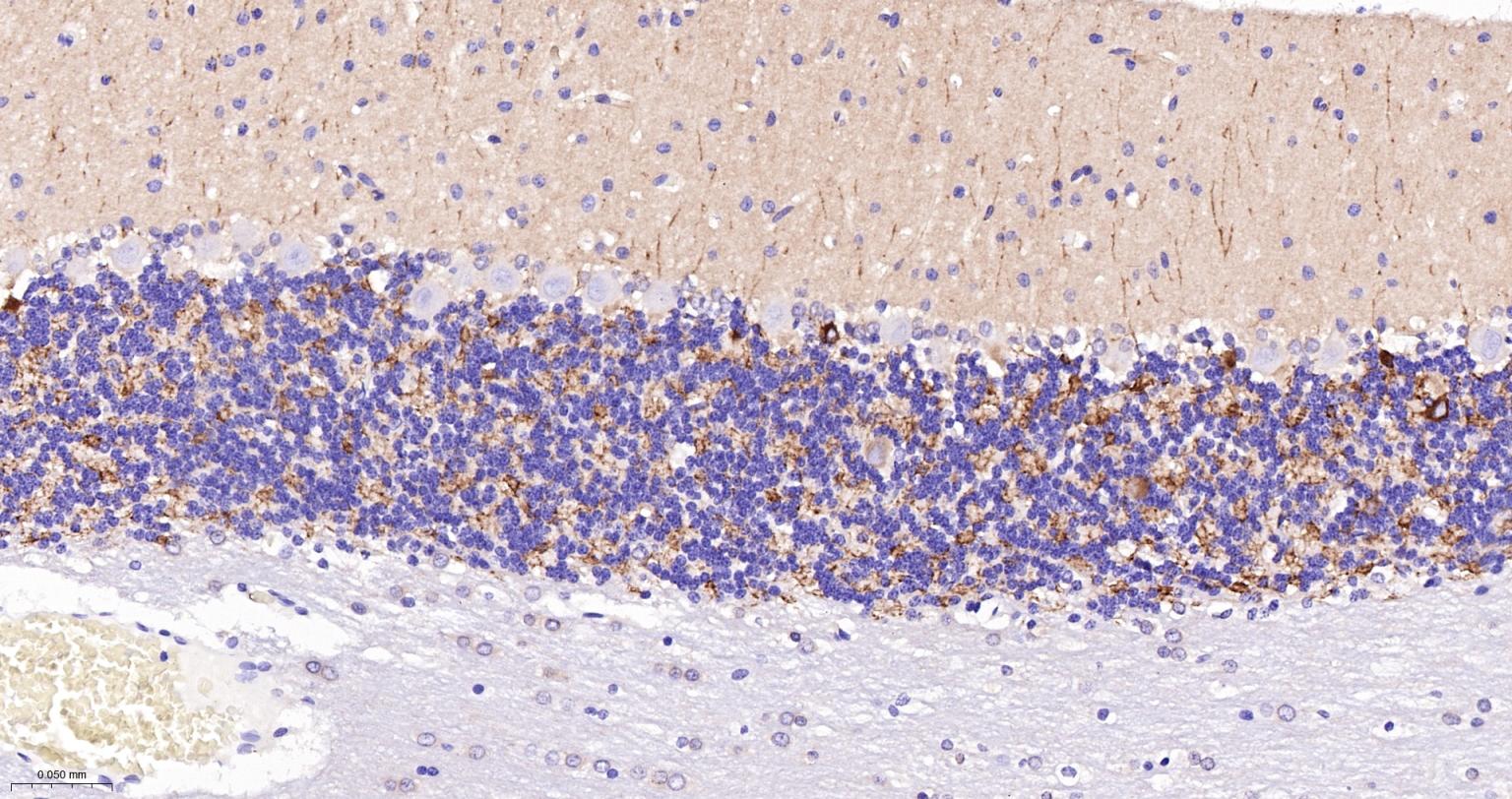 Paraformaldehyde-fixed, paraffin embedded Mouse Cerebellum; Antigen retrieval by boiling in sodium citrate buffer (pH6.0) for 15 min; The section was incubated with GRM2 Monoclonal Antibody, Unconjugated (bsm-61365R) at 1:200 overnight at 4°C, followed by conjugation to the bs-0295G-HRP and DAB (C-0010) staining.