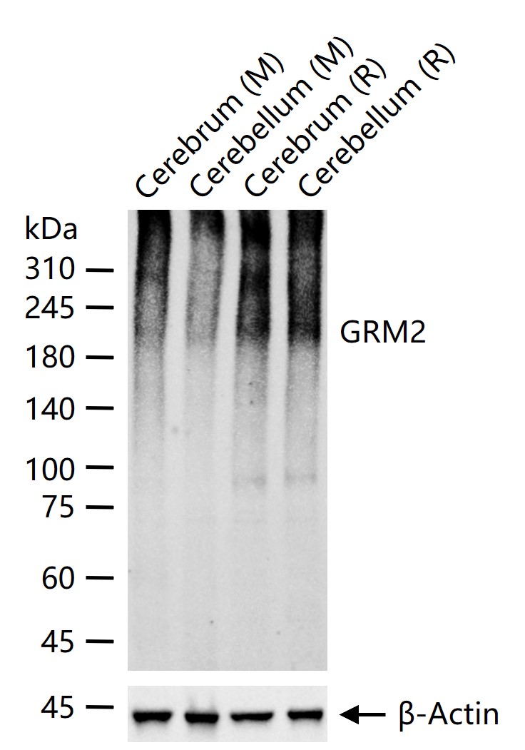 25 ug total protein per lane of various lysates (see on figure) probed with GRM2 monoclonal antibody, unconjugated (bsm-61365R) at 1:1000 dilution and 4°C overnight incubation. Followed by conjugated secondary antibody incubation at r.t. for 60 min.