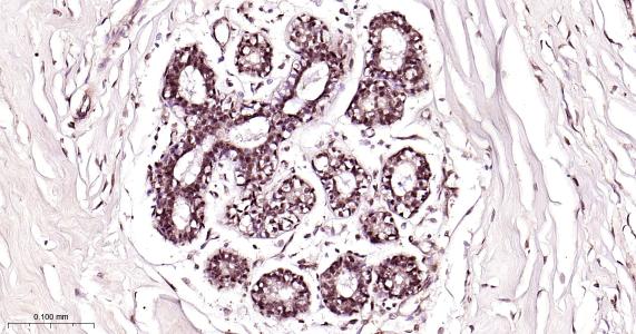 Paraformaldehyde-fixed, paraffin embedded Human Breast; Antigen retrieval by boiling in sodium citrate buffer (pH6.0) for 15 min; Antibody incubation with TLS/FUS Monoclonal Antibody, Unconjugated(bsm-61371R) at 1:200 overnight at 4°C, followed by conjugation to the bs-0295G-HRP and DAB (C-0010) staining.