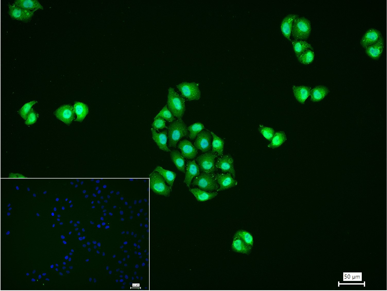 4% Paraformaldehyde-fixed Hela (H) cell; Triton X-100 at r.t. for 20 min; Antibody incubation with (FUS) monoclonal Antibody, unconjugated (bsm-61371R) 1:100, 90 min at 37°C; followed by conjugated Goat Anti-Rabbit IgG antibody (green, bs-40295G-FITC) at 37°C for 90 min, DAPI (blue, C02-04002) was used to stain the cell nuclei. PBS instead of the primary antibody was used as the blank control.