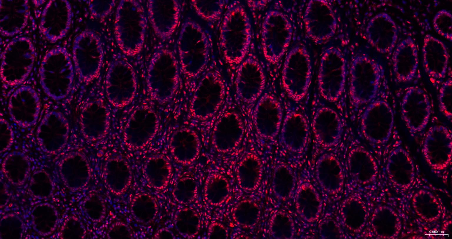 Paraformaldehyde-fixed, paraffin embedded Human Colon; Antigen retrieval by boiling in sodium citrate buffer (pH6.0) for 15 min; The section was incubated with FUS Monoclonal Antibody, Unconjugated (bsm-61371R) at 1:200 overnight at 4°C. Followed by conjugated Goat Anti-Rabbit IgG antibody (Red, bs-0295G-BF594), DAPI (blue, C02-04002) was used to stain the cell nuclei.