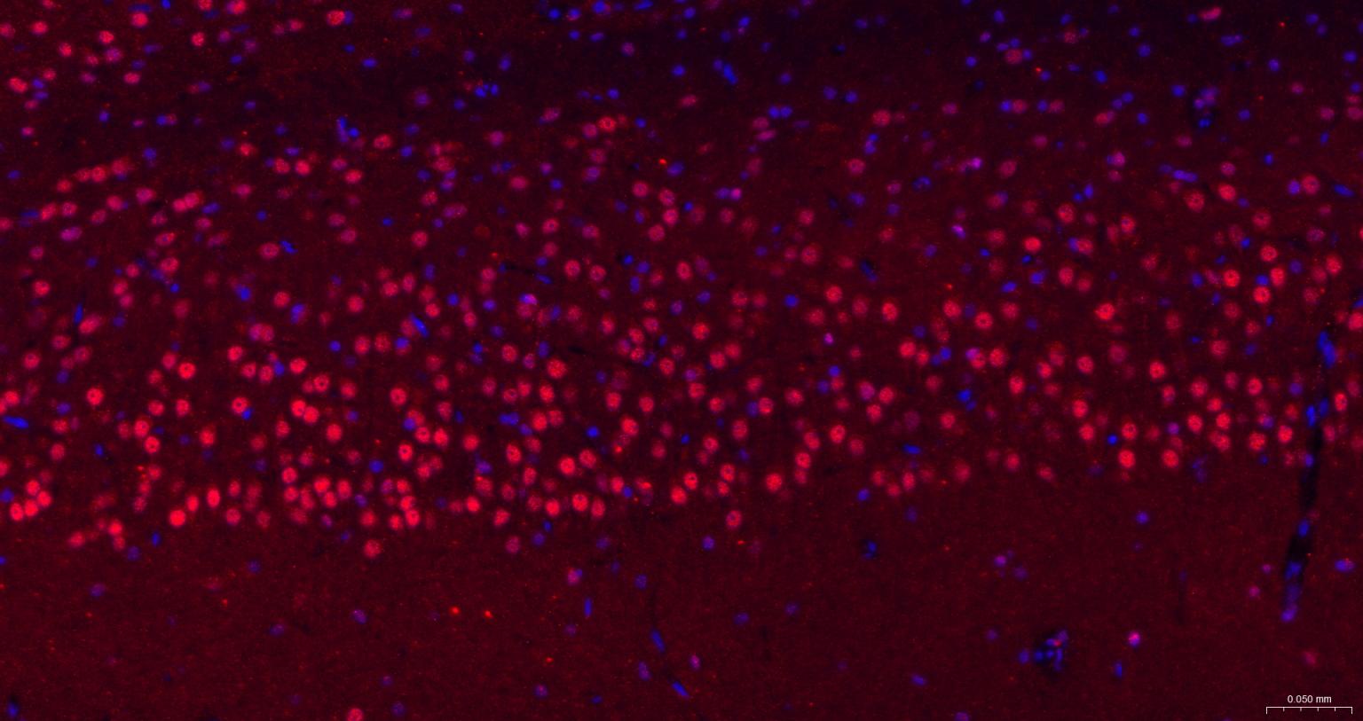 Paraformaldehyde-fixed, paraffin embedded Rat Cerebrum; Antigen retrieval by boiling in sodium citrate buffer (pH6.0) for 15 min; The section was incubated with FUS Monoclonal Antibody, Unconjugated (bsm-61371R) at 1:200 overnight at 4°C. Followed by conjugated Goat Anti-Rabbit IgG antibody (Red, bs-0295G-BF594), DAPI (blue, C02-04002) was used to stain the cell nuclei.