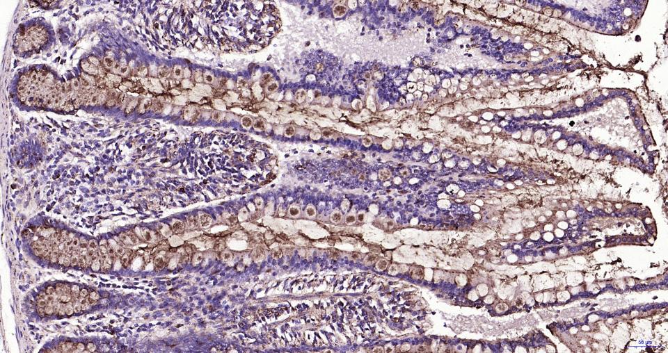 Paraformaldehyde-fixed, paraffin embedded Human Small Intestine; Antigen retrieval by boiling in sodium citrate buffer (pH6.0) for 15 min; Antibody incubation with LAMP1 Monoclonal Antibody, Unconjugated(bsm-61375R) at 1:200 overnight at 4°C, followed by conjugation to the SP Kit (Rabbit, SP-0023)and DAB (C-0010) staining.