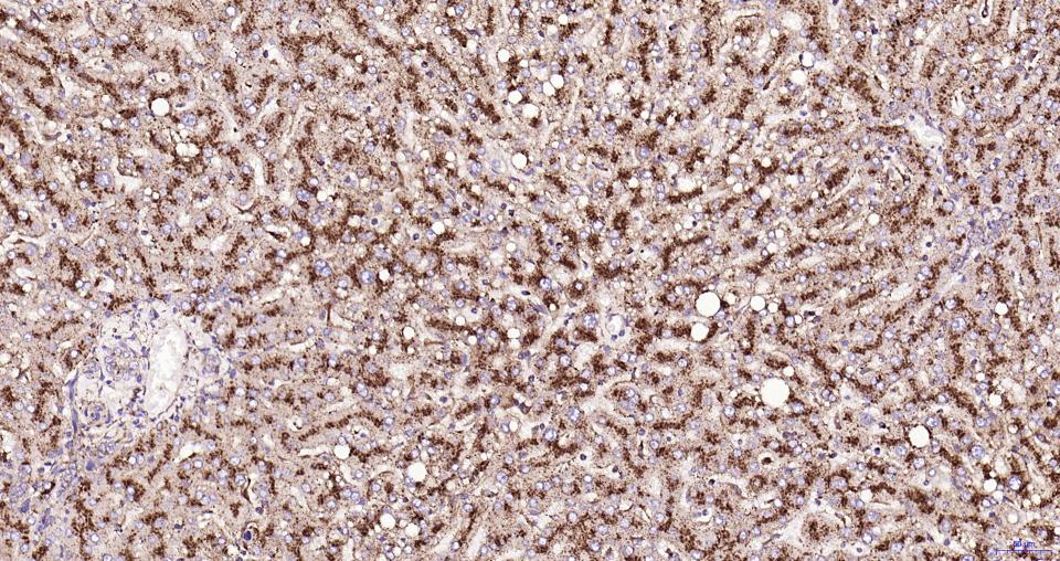 Paraformaldehyde-fixed, paraffin embedded Human Liver; Antigen retrieval by boiling in sodium citrate buffer (pH6.0) for 15 min; Antibody incubation with LAMP1 Monoclonal Antibody, Unconjugated(bsm-61375R) at 1:200 overnight at 4°C, followed by conjugation to the SP Kit (Rabbit, SP-0023)and DAB (C-0010) staining.
