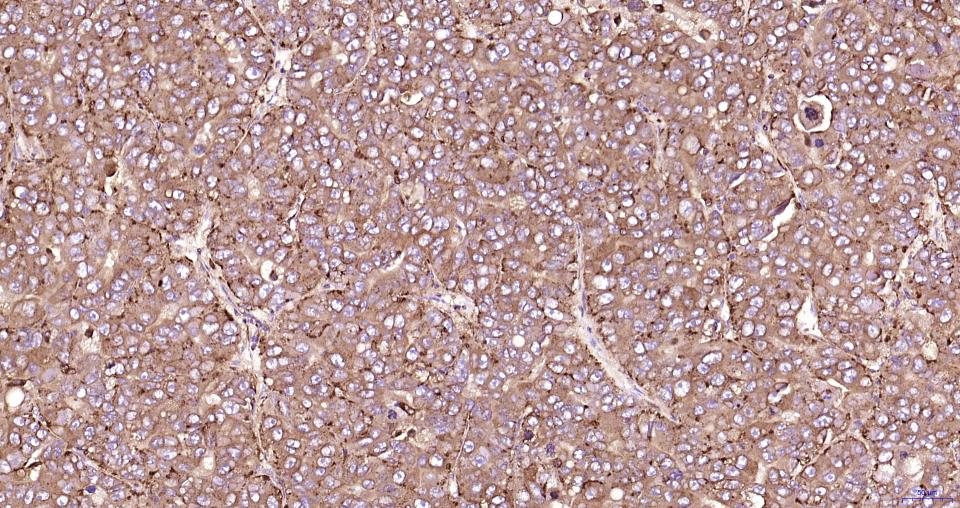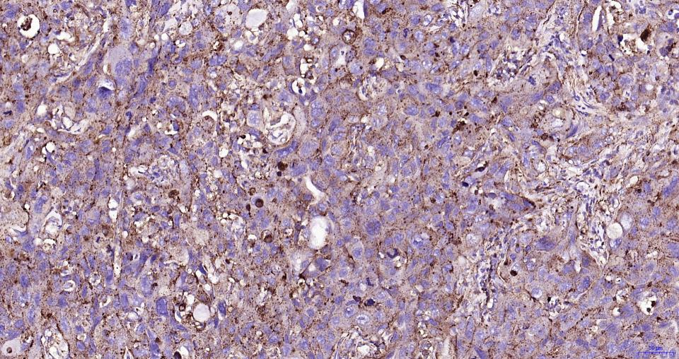 Paraformaldehyde-fixed, paraffin embedded Human Liver Cancer; Antigen retrieval by boiling in sodium citrate buffer (pH6.0) for 15 min; Antibody incubation with LAMP1 Monoclonal Antibody, Unconjugated(bsm-61375R) at 1:200 overnight at 4°C, followed by conjugation to the SP Kit (Rabbit, SP-0023)and DAB (C-0010) staining.