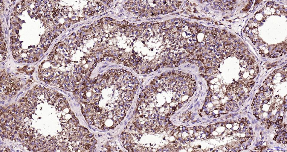Paraformaldehyde-fixed, paraffin embedded Human Testicles; Antigen retrieval by boiling in sodium citrate buffer (pH6.0) for 15 min; Antibody incubation with LAMP1 Monoclonal Antibody, Unconjugated(bsm-61375R) at 1:200 overnight at 4°C, followed by conjugation to the SP Kit (Rabbit, SP-0023)and DAB (C-0010) staining.