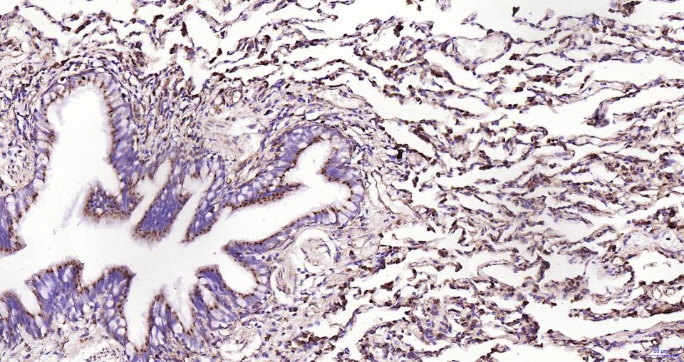Paraformaldehyde-fixed, paraffin embedded Human Lung; Antigen retrieval by boiling in sodium citrate buffer (pH6.0) for 15 min; Antibody incubation with LAMP1 Monoclonal Antibody, Unconjugated(bsm-61375R) at 1:200 overnight at 4°C, followed by conjugation to the SP Kit (Rabbit, SP-0023)and DAB (C-0010) staining.
