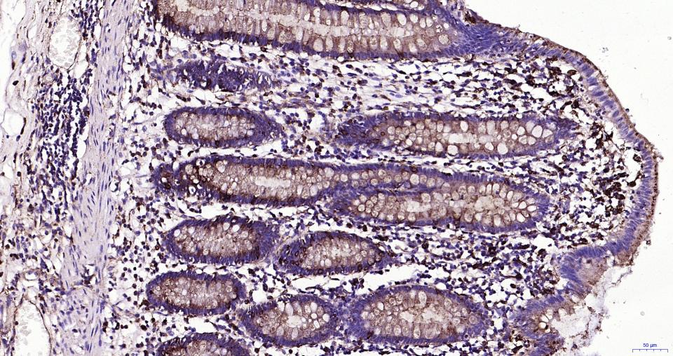 Paraformaldehyde-fixed, paraffin embedded Human Colon; Antigen retrieval by boiling in sodium citrate buffer (pH6.0) for 15 min; Antibody incubation with LAMP1 Monoclonal Antibody, Unconjugated(bsm-61375R) at 1:200 overnight at 4°C, followed by conjugation to the SP Kit (Rabbit, SP-0023)and DAB (C-0010) staining.