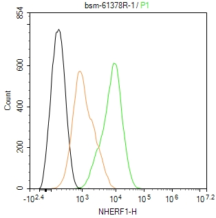 The HepG2 (H) cells were fixed with 4% PFA (10 min at r.t.) and then permeabilized with 90% ice-cold methanol for 20 min at -20℃,the cells then were incubated in 5%BSA to block non-specific protein-protein interactions (30 min at r.t.), followed by secondary antibody incubation for 40 min at room temperature. Primary Antibody (green):Rabbit Anti-NHERF1 antibody (bsm-61378R,1:100); Isotype Control (orange): Rabbit IgG (bs-0295P). Blank control (black): PBS. Acquisition of 20,000 events was performed.