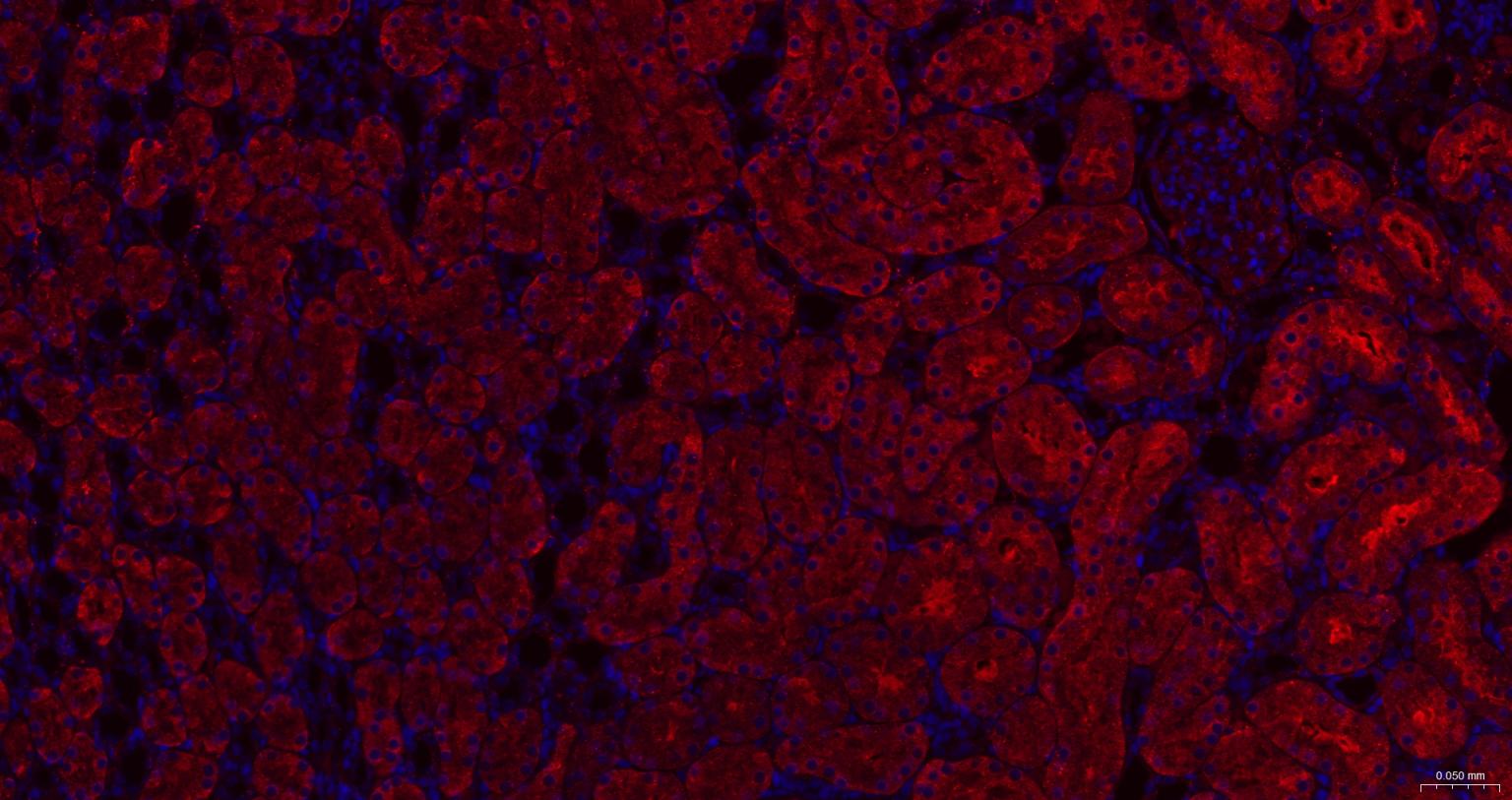 Paraformaldehyde-fixed, paraffin embedded Rat Kidney; Antigen retrieval by boiling in sodium citrate buffer (pH6.0) for 15 min; The section was incubated with NHERF1 Monoclonal Antibody, Unconjugated (bsm-61378R) at 1:200 overnight at 4°C. Followed by conjugated Goat Anti-Ratbbit IgG antibody (Red, bs-0295G-BF594), DAPI (blue, C02-04002) was used to stain the cell nuclei.