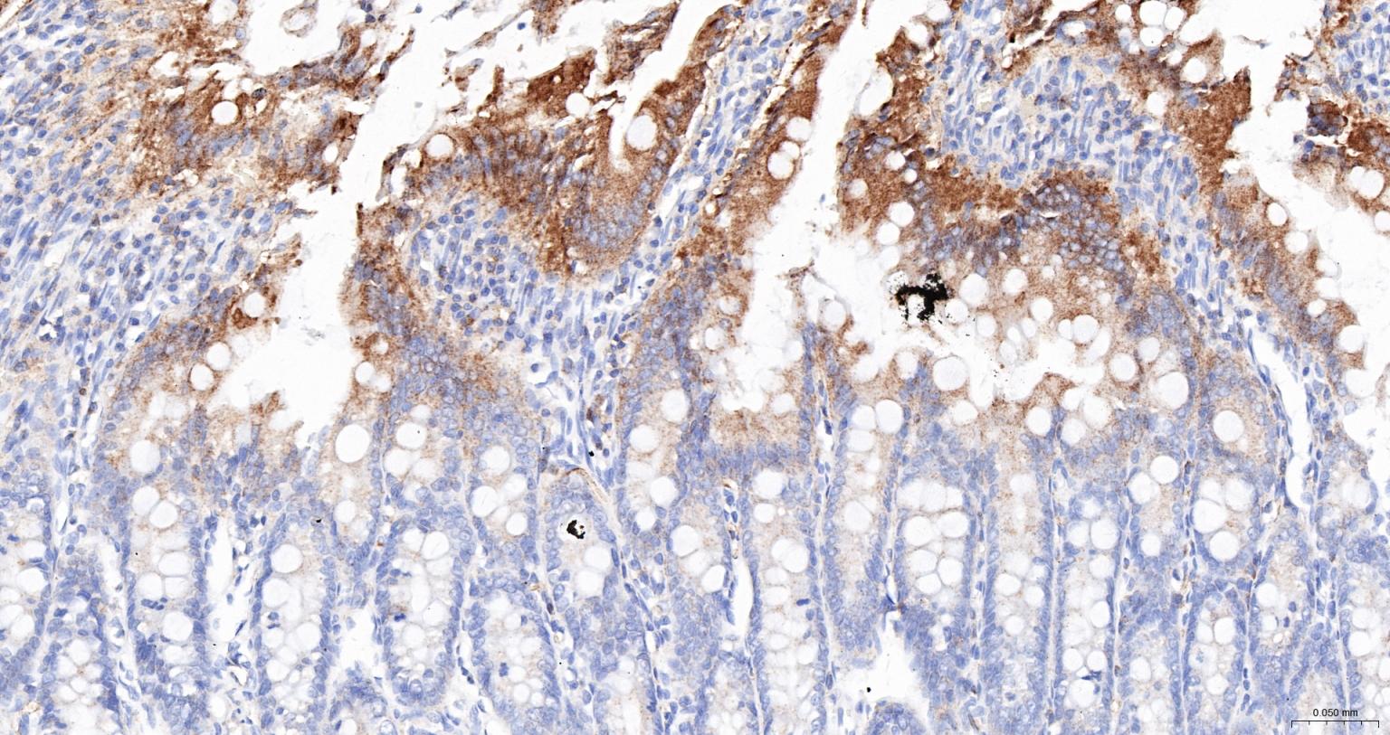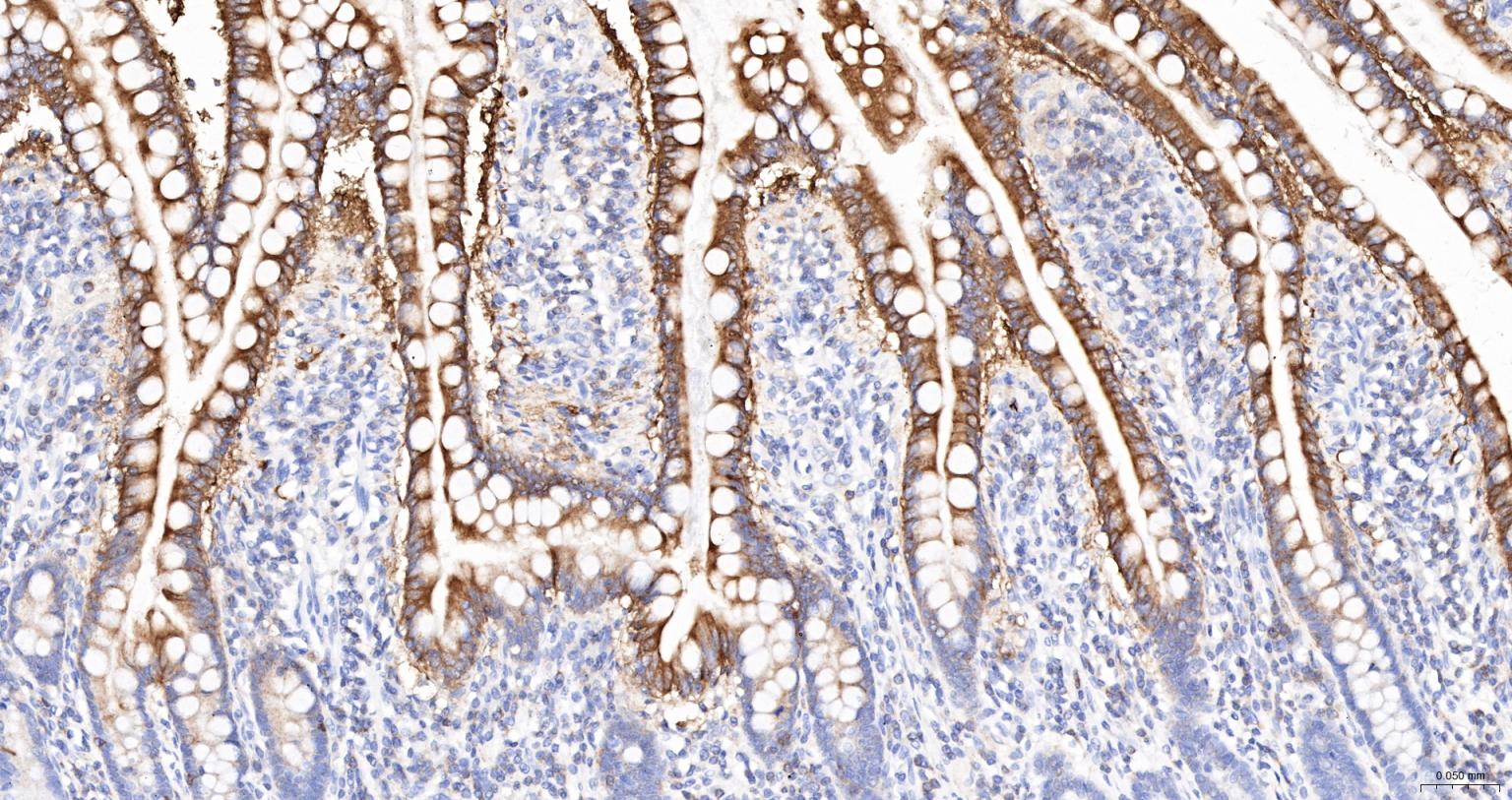 Paraformaldehyde-fixed, paraffin embedded Rat Small Intestine; Antigen retrieval by boiling in sodium citrate buffer (pH6.0) for 15 min; The section was incubated with NHERF1 Monoclonal Antibody, Unconjugated (bsm-61378R) at 1:200 overnight at 4°C, followed by conjugation to the bs-0295G-HRP and DAB (C-0010) staining.