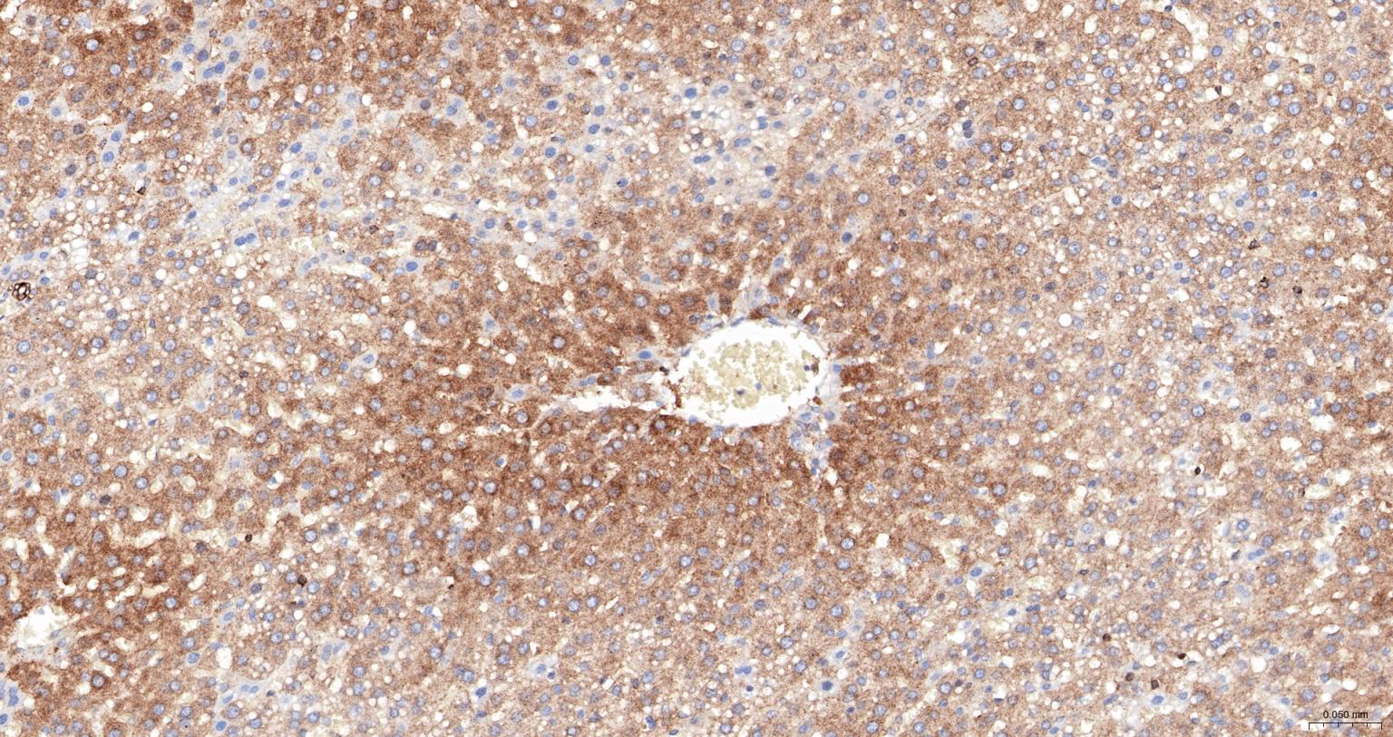 Paraformaldehyde-fixed, paraffin embedded Rat Liver; Antigen retrieval by boiling in sodium citrate buffer (pH6.0) for 15 min; The section was incubated with NHERF1 Monoclonal Antibody, Unconjugated (bsm-61378R) at 1:200 overnight at 4°C, followed by conjugation to the bs-0295G-HRP and DAB (C-0010) staining.