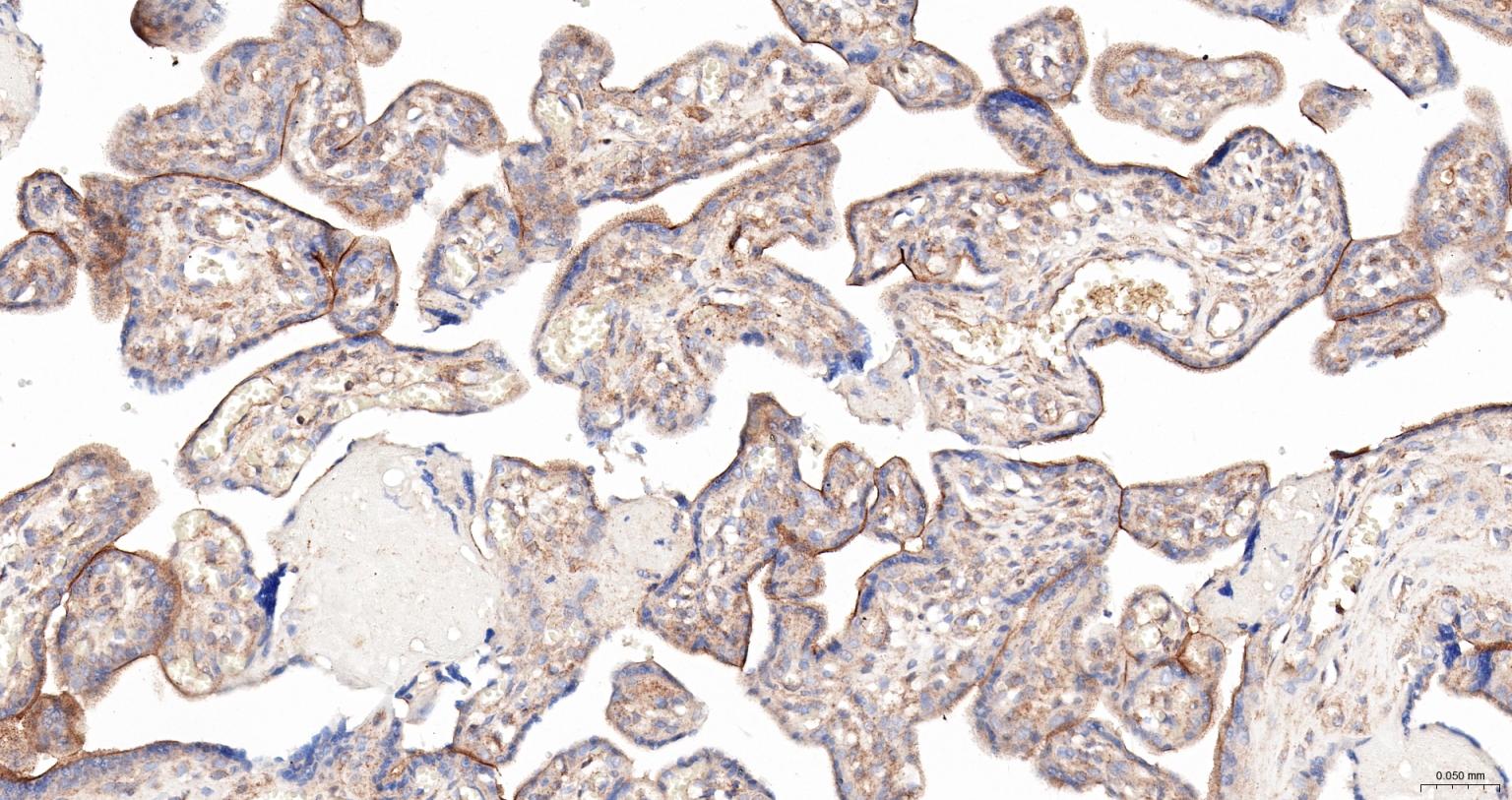 Paraformaldehyde-fixed, paraffin embedded Human Placenta; Antigen retrieval by boiling in sodium citrate buffer (pH6.0) for 15 min; The section was incubated with NHERF1 Monoclonal Antibody, Unconjugated (bsm-61378R) at 1:200 overnight at 4°C, followed by conjugation to the bs-0295G-HRP and DAB (C-0010) staining.
