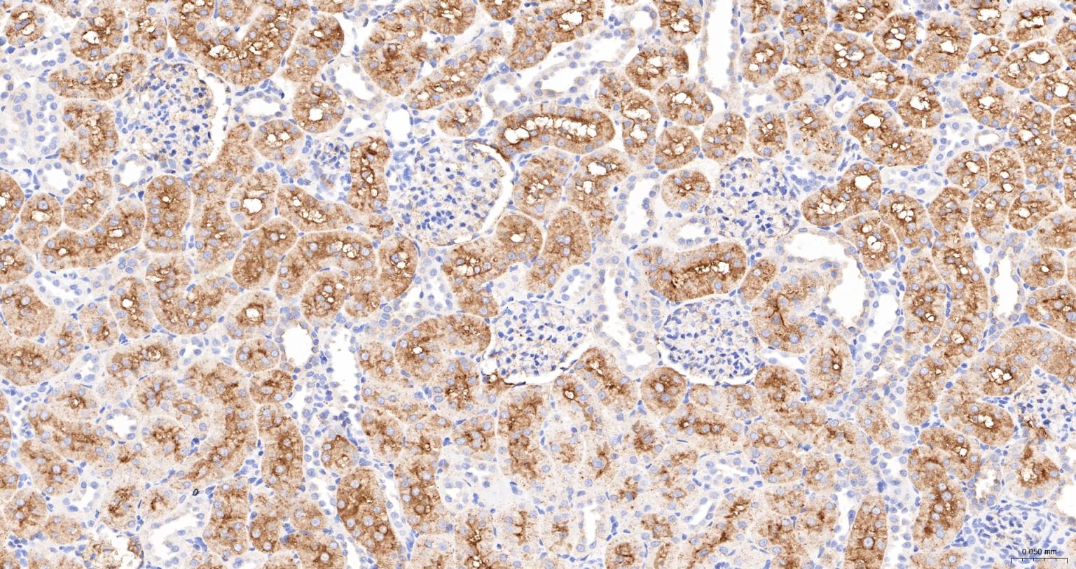 Paraformaldehyde-fixed, paraffin embedded Rat Kidney; Antigen retrieval by boiling in sodium citrate buffer (pH6.0) for 15 min; The section was incubated with NHERF1 Monoclonal Antibody, Unconjugated (bsm-61378R) at 1:200 overnight at 4°C, followed by conjugation to the bs-0295G-HRP and DAB (C-0010) staining.