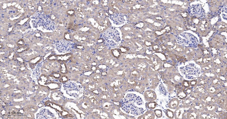 Paraformaldehyde-fixed, paraffin embedded Mouse Kidney; Antigen retrieval by boiling in sodium citrate buffer (pH6.0) for 15 min; The section was incubated with IDE Monoclonal Antibody, Unconjugated (bsm-61379R) at 1:200 overnight at 4°C, followed by conjugation to the bs-0295G-HRP and DAB (C-0010) staining.