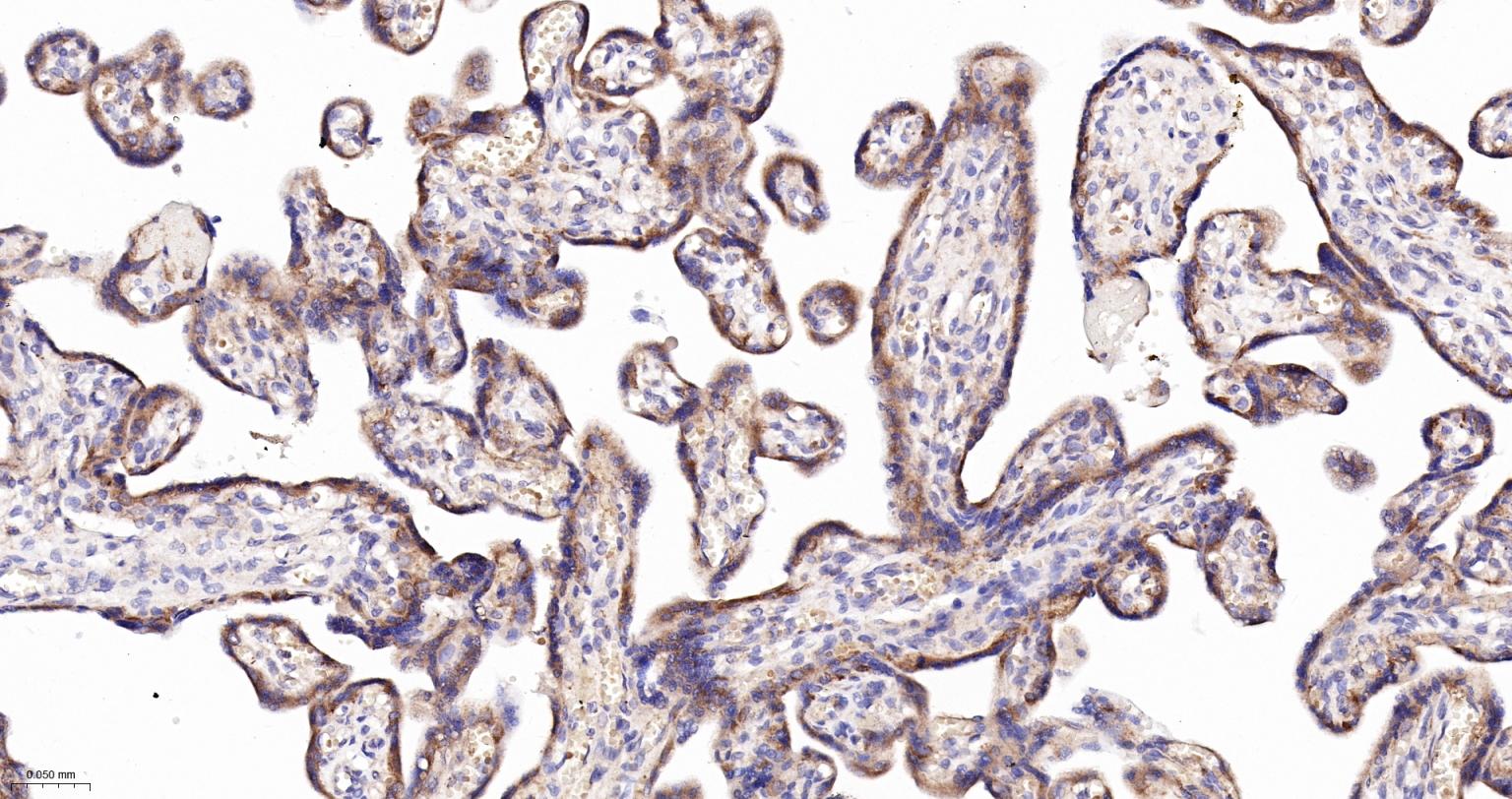 Paraformaldehyde-fixed, paraffin embedded Human Placenta; Antigen retrieval by boiling in sodium citrate buffer (pH6.0) for 15 min; The section was incubated with VAMP8 Monoclonal Antibody, Unconjugated (bsm-61388R) at 1:200 overnight at 4°C, followed by conjugation to the bs-0295G-HRP and DAB (C-0010) staining.