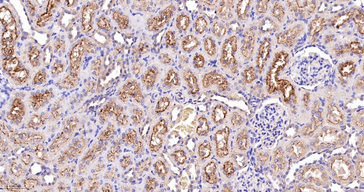 Paraformaldehyde-fixed, paraffin embedded Rat Kidney; Antigen retrieval by boiling in sodium citrate buffer (pH6.0) for 15 min; The section was incubated with VAMP8 Monoclonal Antibody, Unconjugated (bsm-61388R) at 1:200 overnight at 4°C, followed by conjugation to the bs-0295G-HRP and DAB (C-0010) staining.