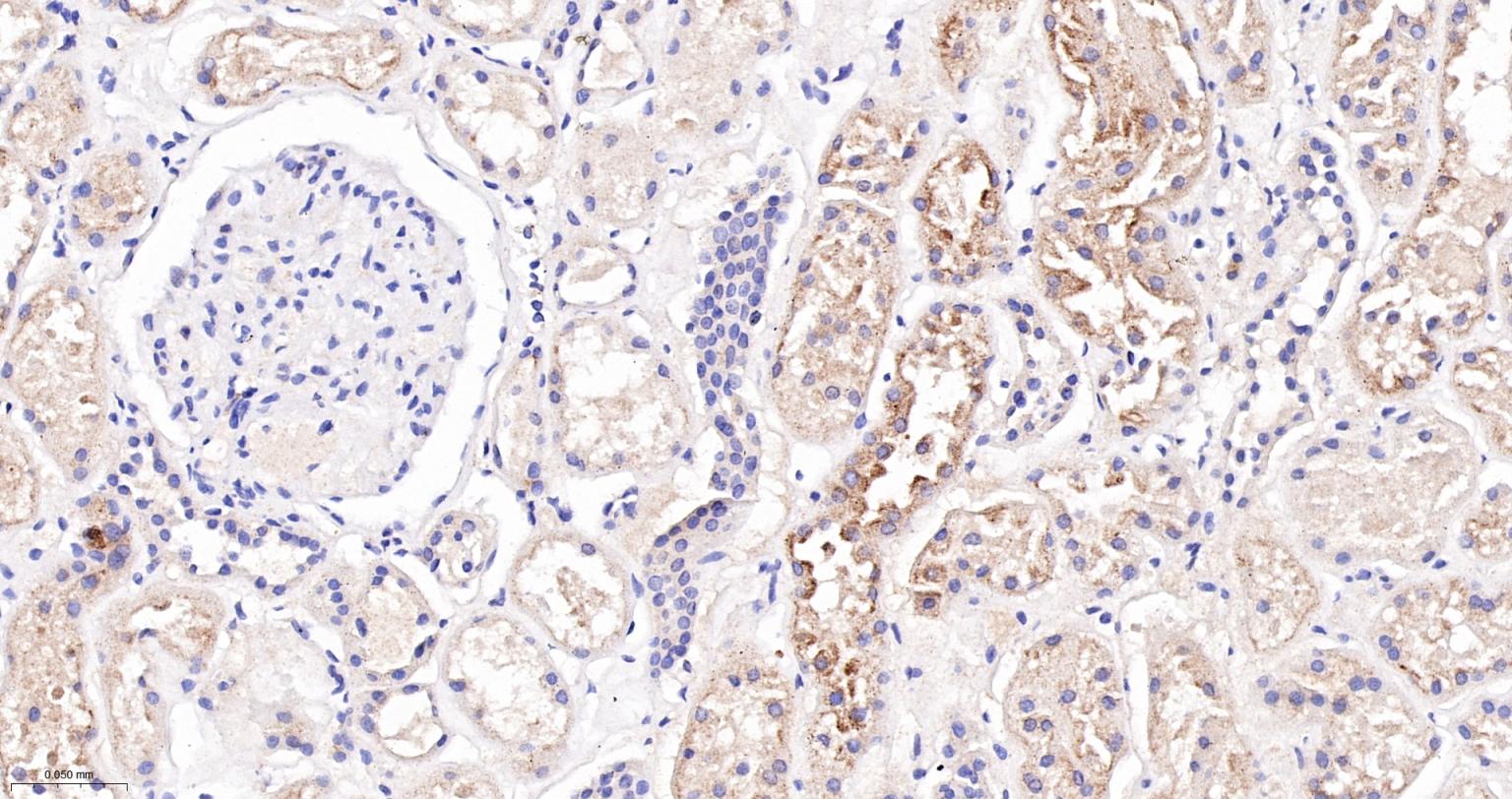 Paraformaldehyde-fixed, paraffin embedded Human Kidney; Antigen retrieval by boiling in sodium citrate buffer (pH6.0) for 15 min; The section was incubated with VAMP8 Monoclonal Antibody, Unconjugated (bsm-61388R) at 1:200 overnight at 4°C, followed by conjugation to the bs-0295G-HRP and DAB (C-0010) staining.