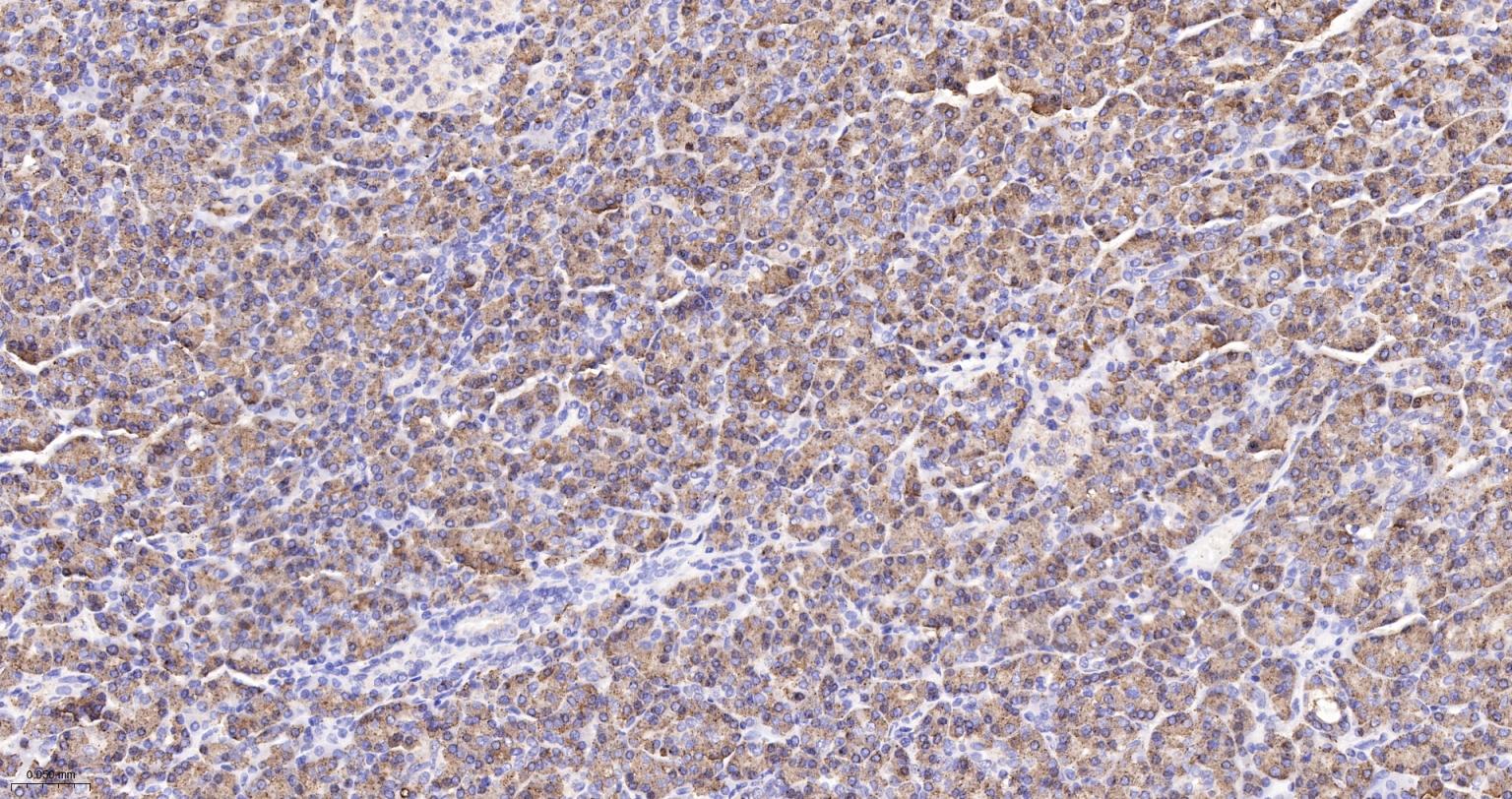 Paraformaldehyde-fixed, paraffin embedded Human Pancreas; Antigen retrieval by boiling in sodium citrate buffer (pH6.0) for 15 min; The section was incubated with VAMP8 Monoclonal Antibody, Unconjugated (bsm-61388R) at 1:200 overnight at 4°C, followed by conjugation to the bs-0295G-HRP and DAB (C-0010) staining
