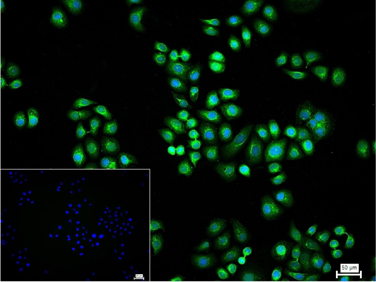 4% Paraformaldehyde-fixed HepG2 (H) cell; Triton X-100 at r.t. for 20 min; Antibody incubation with (PDIA6) monoclonal Antibody, unconjugated (bsm-61392R) 1:100, 90 min at 37°C; followed by conjugated Goat Anti-Rabbit IgG antibody (green, bs-60295G-BF488) at 37°C for 90 min, DAPI (blue, C02-04002) was used to stain the cell nuclei. PBS instead of the primary antibody was used as the blank control.