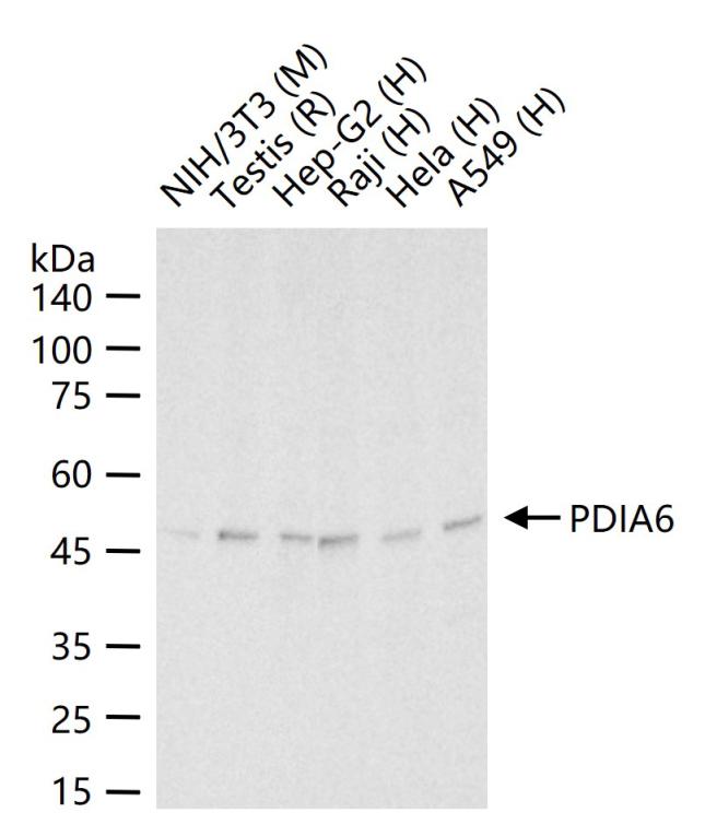 25 ug total protein per lane of various lysates (see on figure) probed with PDIA6 monoclonal antibody, unconjugated (bsm-61392R) at 1:1000 dilution and 4°C overnight incubation. Followed by conjugated secondary antibody incubation at r.t. for 60 min.