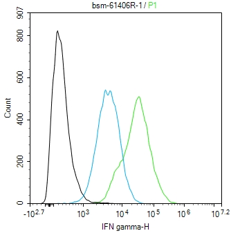 The Jurkat(Treated with PMA (25 ng/mL, 6 h) and ionomycin (1 µg/mL, 6 h), BFA (5 µg/ml, last 5 h)) (H) cells were fixed with 4% PFA (10 min at r.t.) and then permeabilized with 90% ice-cold methanol for 20 min at -20℃,the cells then were incubated in 5%BSA to block non-specific protein-protein interactions (30 min at r.t.).Primary Antibody (green):Rabbit Anti-IFN gamma antibody (bsm-61406R;1:100); Secondary Antibody (white blue): Goat anti-Rabbit IgG-BF488 (bs-60295G-BF488): 1 μg/test. Blank control (black): PBS. Acquisition of 20,000 events was performed.