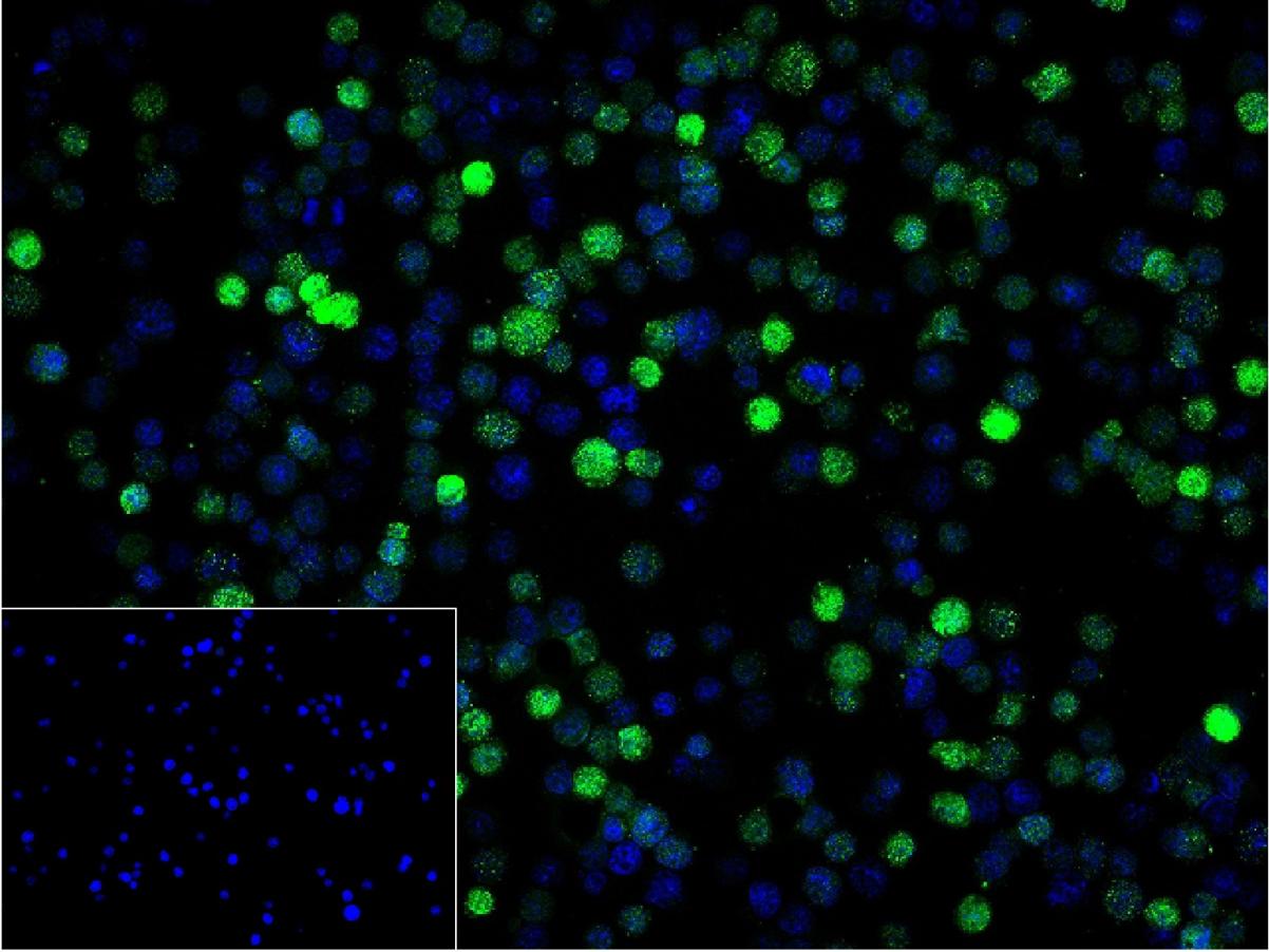 4% Paraformaldehyde-fixed Jurkat(Treated with PMA (25 ng/mL, 6 h) and ionomycin (1 µg/mL, 6 h), BFA (5 µg/ml, last 5 h))(H) cell; Triton X-100 at r.t. for 20 min; Antibody incubation with (IFN gamma) monoclonal Antibody, unconjugated (bsm-61406R) 1:100, 90 min at 37°C; followed by conjugated Goat Anti-Rabbit IgG antibody (green, bs-60295G-BF488) at 37°C for 90 min, DAPI (blue, C02-04002) was used to stain the cell nuclei. PBS instead of the primary antibody was used as the blank control.