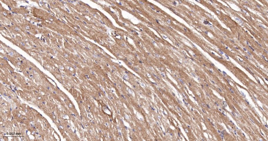 Paraformaldehyde-fixed, paraffin embedded Rat Heart; Antigen retrieval by boiling in sodium citrate buffer (pH6.0) for 15 min; The section was incubated with SERCA2 Monoclonal Antibody, Unconjugated (bsm-61408R) at 1:200 overnight at 4°C, followed by conjugation to the bs-0295G-HRP and DAB (C-0010) staining.