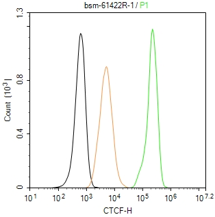 The Hela (H) cells were fixed with 4% PFA (10 min at r.t.) and then permeabilized with 90% ice-cold methanol for 20 min at -20℃,the cells then were incubated in 5%BSA to block non-specific protein-protein interactions (30 min at r.t.), followed by secondary antibody incubation for 40 min at room temperature. Primary Antibody (green):Rabbit Anti-CTCF antibody (bsm-61422R,1:100); Isotype Control (orange): Rabbit IgG (bs-0295P). Blank control (black): PBS. Acquisition of 20,000 events was performed.