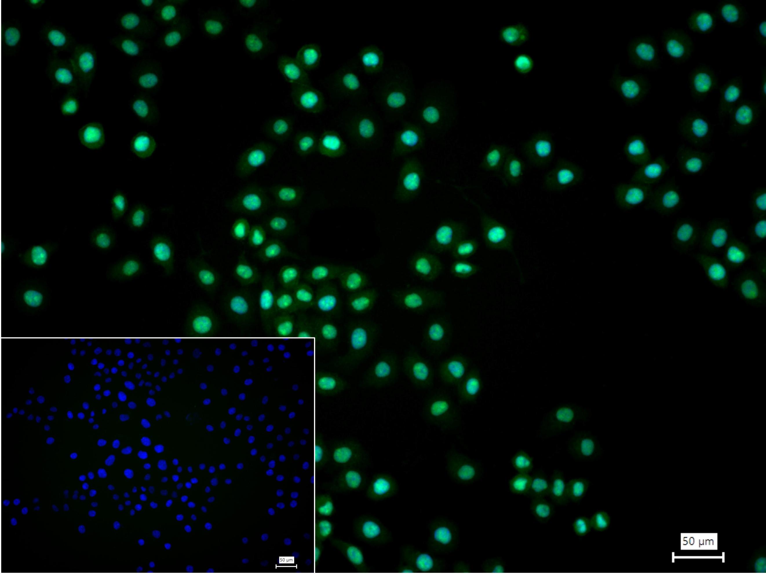 4% Paraformaldehyde-fixed Hela (H) cell; Triton X-100 at r.t. for 20 min; Antibody incubation with (CTCF) monoclonal Antibody, unconjugated (bsm-61422R) 1:100, 90 min at 37°C; followed by conjugated Goat Anti-Rabbit IgG antibody (green, bs-60295G-BF488) at 37°C for 90 min, DAPI (blue, C02-04002) was used to stain the cell nuclei. PBS instead of the primary antibody was used as the blank control.