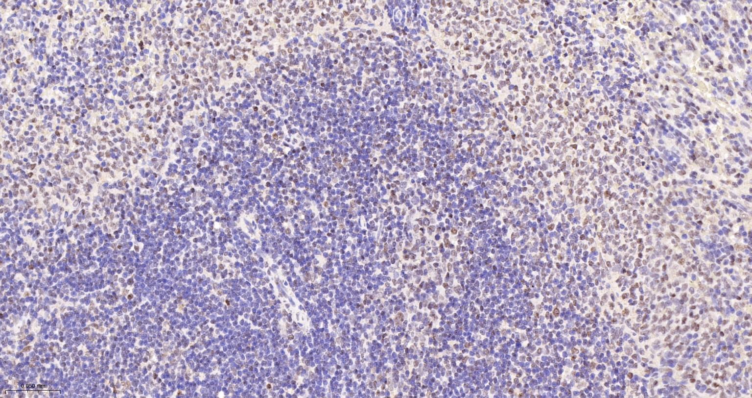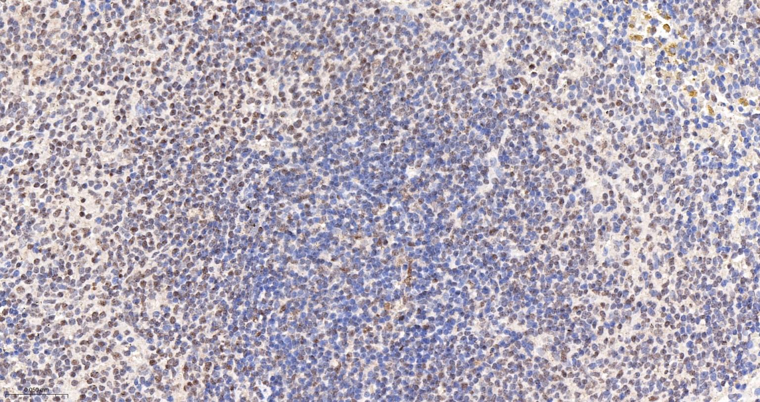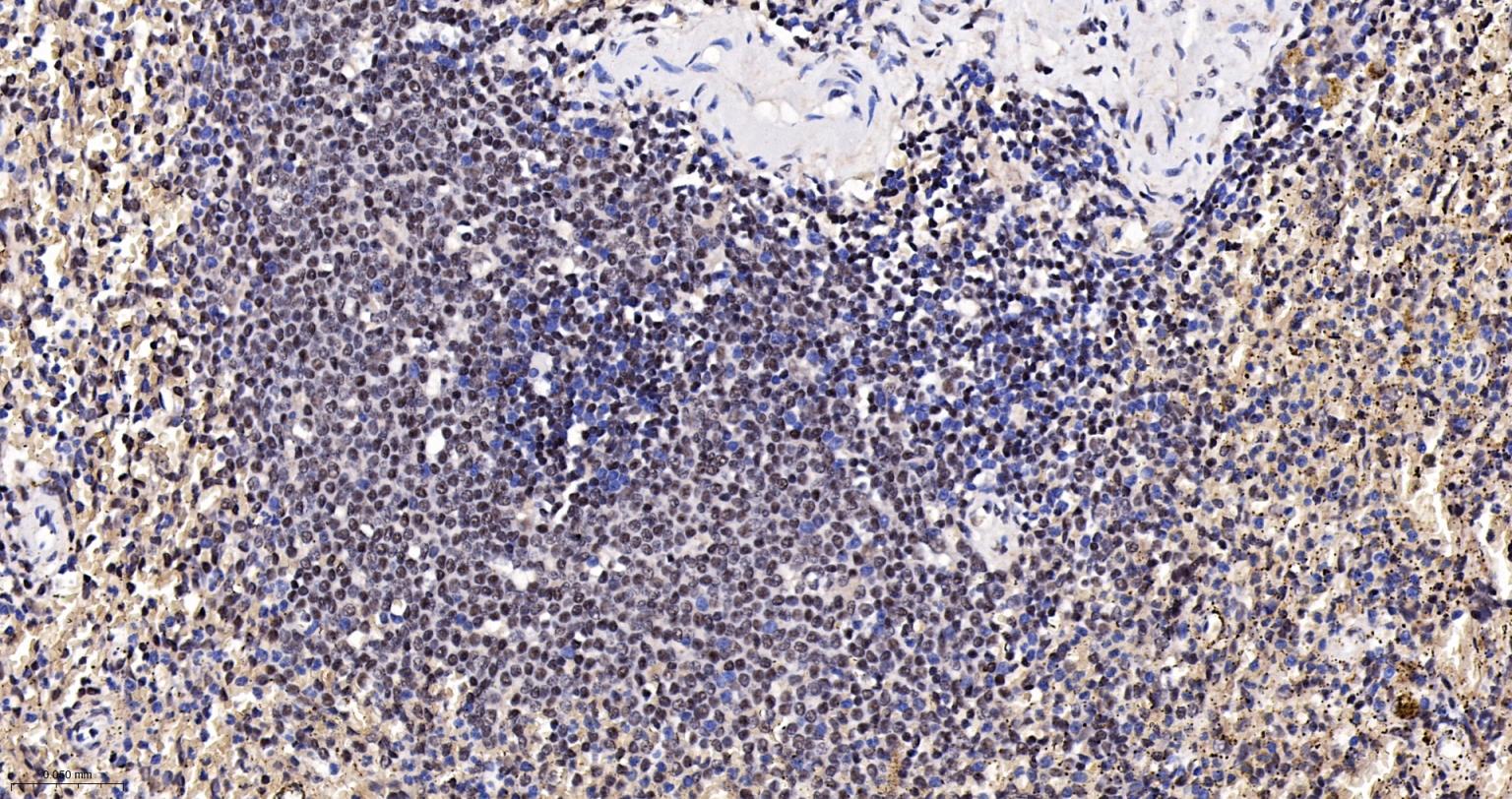 Paraformaldehyde-fixed, paraffin embedded Human Spleen; Antigen retrieval by boiling in sodium citrate buffer (pH6.0) for 15 min; The section was incubated with CTCF Monoclonal Antibody, Unconjugated (bsm-61422R) at 1:200 overnight at 4°C, followed by conjugation to the bs-0295G-HRP and DAB (C-0010) staining.