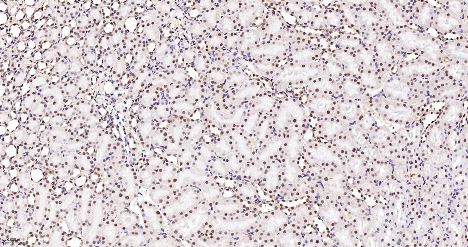 Paraformaldehyde-fixed, paraffin embedded Rat Kidney; Antigen retrieval by boiling in sodium citrate buffer (pH6.0) for 15 min; The section was incubated with CTCF Monoclonal Antibody, Unconjugated (bsm-61422R) at 1:200 overnight at 4°C, followed by conjugation to the bs-0295G-HRP and DAB (C-0010) staining.
