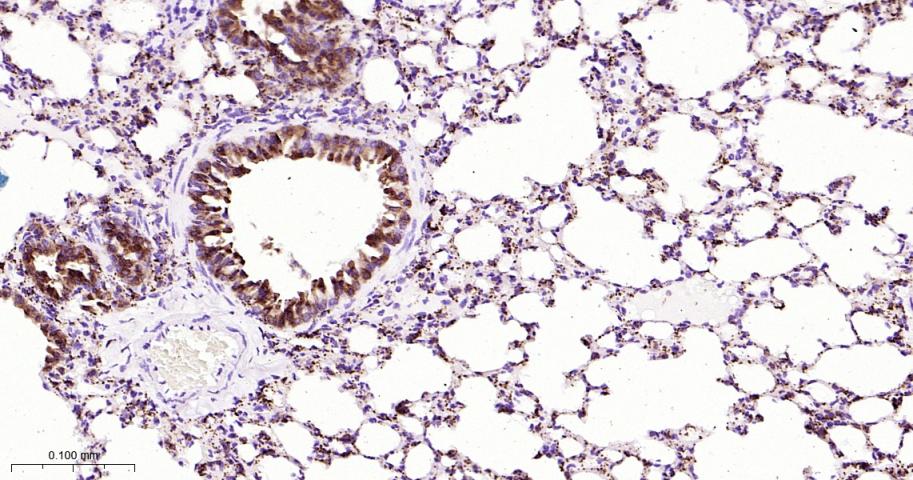 Paraformaldehyde-fixed, paraffin embedded Mouse Lung; Antigen retrieval by boiling in sodium citrate buffer (pH6.0) for 15 min; The section was incubated with Cathepsin L/V/K/H Monoclonal Antibody, Unconjugated (bsm-61433R) at 1:200 overnight at 4°C, followed by conjugation to the bs-0295G-HRP and DAB (C-0010) staining.
