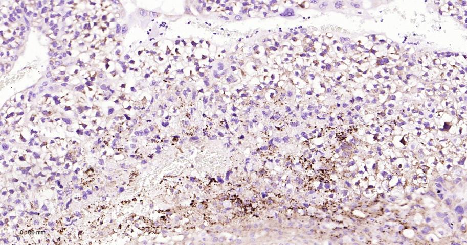 Paraformaldehyde-fixed, paraffin embedded Mouse Placenta; Antigen retrieval by boiling in sodium citrate buffer (pH6.0) for 15 min; The section was incubated with Cathepsin L/V/K/H Monoclonal Antibody, Unconjugated (bsm-61433R) at 1:200 overnight at 4°C, followed by conjugation to the bs-0295G-HRP and DAB (C-0010) staining.