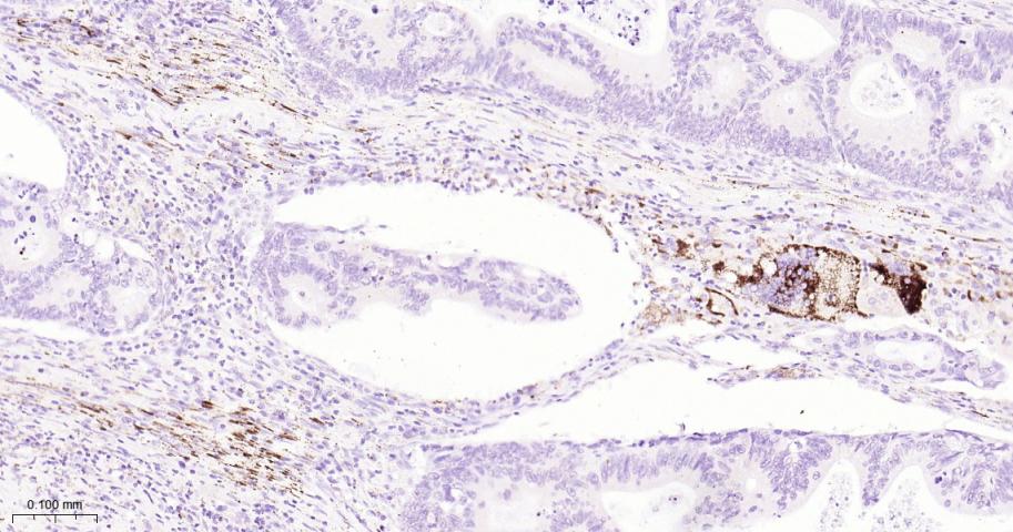 Paraformaldehyde-fixed, paraffin embedded Human Colon Cancer; Antigen retrieval by boiling in sodium citrate buffer (pH6.0) for 15 min; The section was incubated with Cathepsin L/V/K/H Monoclonal Antibody, Unconjugated (bsm-61433R) at 1:200 overnight at 4°C, followed by conjugation to the bs-0295G-HRP and DAB (C-0010) staining.