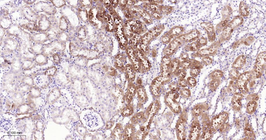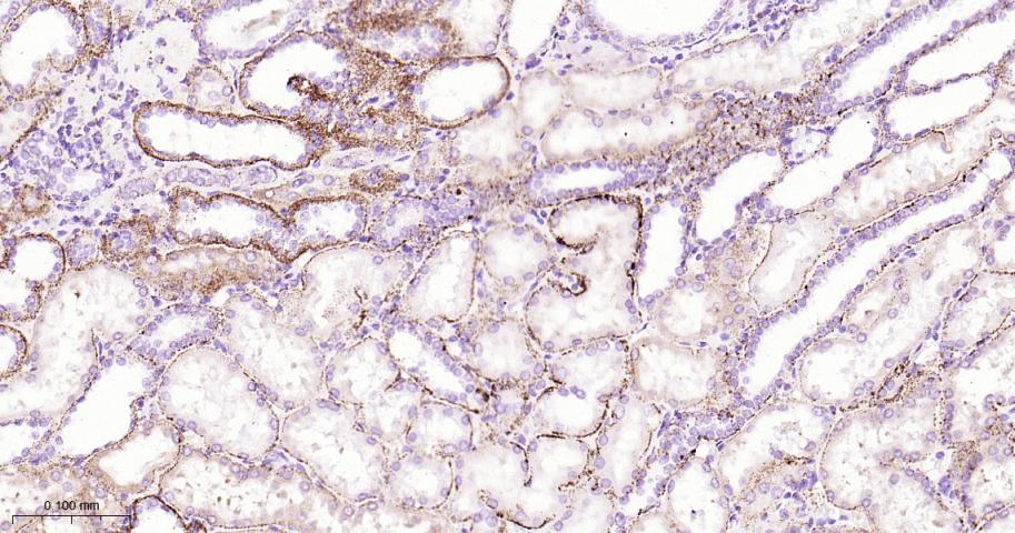 Paraformaldehyde-fixed, paraffin embedded Mouse Kidney; Antigen retrieval by boiling in sodium citrate buffer (pH6.0) for 15 min; The section was incubated with Cathepsin L/V/K/H Monoclonal Antibody, Unconjugated (bsm-61433R) at 1:200 overnight at 4°C, followed by conjugation to the bs-0295G-HRP and DAB (C-0010) staining.
