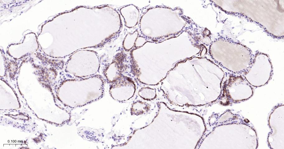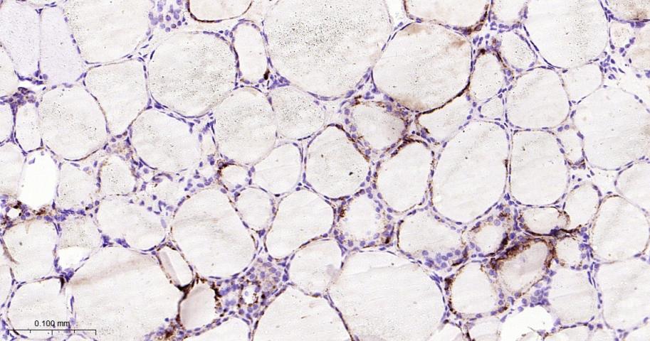 Paraformaldehyde-fixed, paraffin embedded Mouse Thyroid Gland; Antigen retrieval by boiling in sodium citrate buffer (pH6.0) for 15 min; The section was incubated with Cathepsin L/V/K/H Monoclonal Antibody, Unconjugated (bsm-61433R) at 1:200 overnight at 4°C, followed by conjugation to the bs-0295G-HRP and DAB (C-0010) staining.