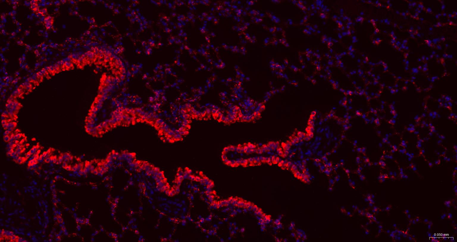 Paraformaldehyde-fixed, paraffin embedded Rat Lung; Antigen retrieval by boiling in sodium citrate buffer (pH6.0) for 15 min; The section was incubated with Cathepsin L/V/K/H Monoclonal Antibody, Unconjugated (bsm-61433R) at 1:200 overnight at 4°C. Followed by conjugated Goat Anti-Rabbit IgG antibody (Red, bs-0295G-BF594), DAPI (blue, C02-04002) was used to stain the cell nuclei.