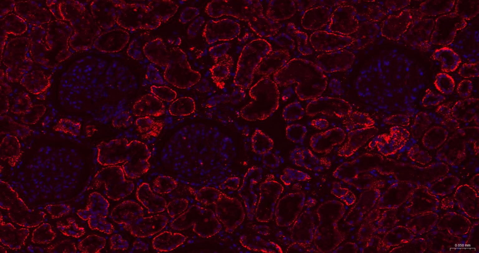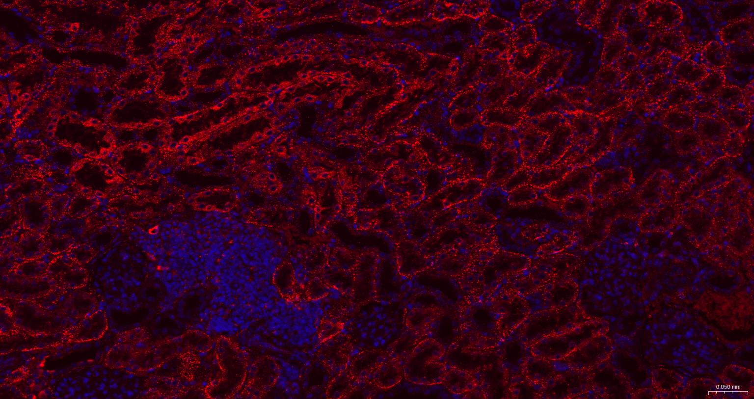 Paraformaldehyde-fixed, paraffin embedded Mouse Kidney; Antigen retrieval by boiling in sodium citrate buffer (pH6.0) for 15 min; The section was incubated with Cathepsin L/V/K/H Monoclonal Antibody, Unconjugated (bsm-61433R) at 1:200 overnight at 4°C. Followed by conjugated Goat Anti-Rabbit IgG antibody (Red, bs-0295G-BF594), DAPI (blue, C02-04002) was used to stain the cell nuclei.