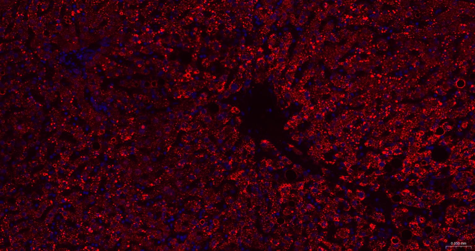 Paraformaldehyde-fixed, paraffin embedded Human Liver; Antigen retrieval by boiling in sodium citrate buffer (pH6.0) for 15 min; The section was incubated with Cathepsin L/V/K/H Monoclonal Antibody, Unconjugated (bsm-61433R) at 1:200 overnight at 4°C. Followed by conjugated Goat Anti-Rabbit IgG antibody (Red, bs-0295G-BF594), DAPI (blue, C02-04002) was used to stain the cell nuclei.