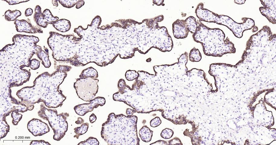 Paraformaldehyde-fixed, paraffin embedded Human Placenta; Antigen retrieval by boiling in sodium citrate buffer (pH6.0) for 15 min; Antibody incubation with GH1 Monoclonal Antibody, Unconjugated(bsm-61438R) at 1:200 overnight at 4°C, followed by conjugation to the bs-0295G-HRP and DAB (C-0010) staining.