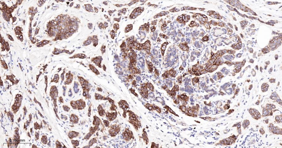 Paraformaldehyde-fixed, paraffin embedded Human Breast Cancer; Antigen retrieval by boiling in sodium citrate buffer (pH6.0) for 15 min; The section was incubated with Integrin beta 4/CD104 Monoclonal Antibody, Unconjugated (bsm-61445R) at 1:200 overnight at 4°C, followed by conjugation to the bs-0295G-HRP and DAB (C-0010) staining.