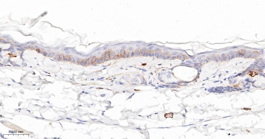 Paraformaldehyde-fixed, paraffin embedded Mouse Skin; Antigen retrieval by boiling in sodium citrate buffer (pH6.0) for 15 min; The section was incubated with Integrin beta 4/CD104 Monoclonal Antibody, Unconjugated (bsm-61445R) at 1:200 overnight at 4°C, followed by conjugation to the bs-0295G-HRP and DAB (C-0010) staining.