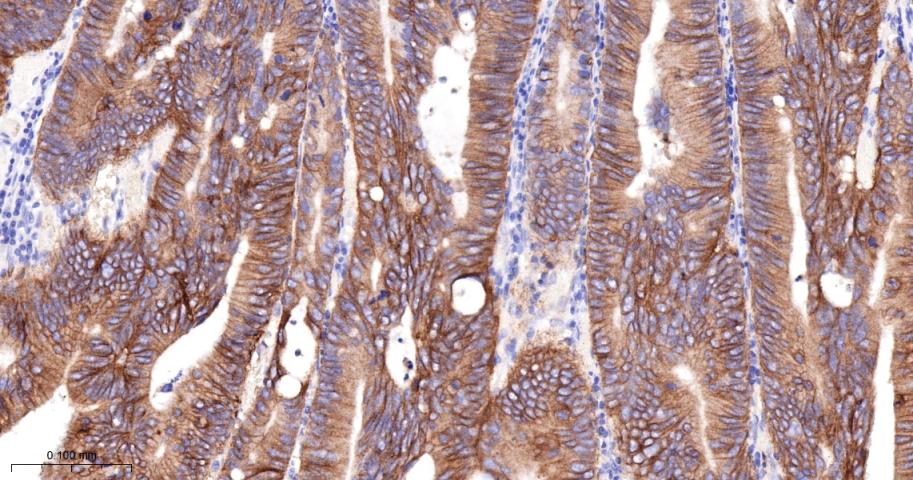 Paraformaldehyde-fixed, paraffin embedded Human Colon Cancer; Antigen retrieval by boiling in sodium citrate buffer (pH6.0) for 15 min; The section was incubated with Integrin beta 4/CD104 Monoclonal Antibody, Unconjugated (bsm-61445R) at 1:200 overnight at 4°C, followed by conjugation to the bs-0295G-HRP and DAB (C-0010) staining.