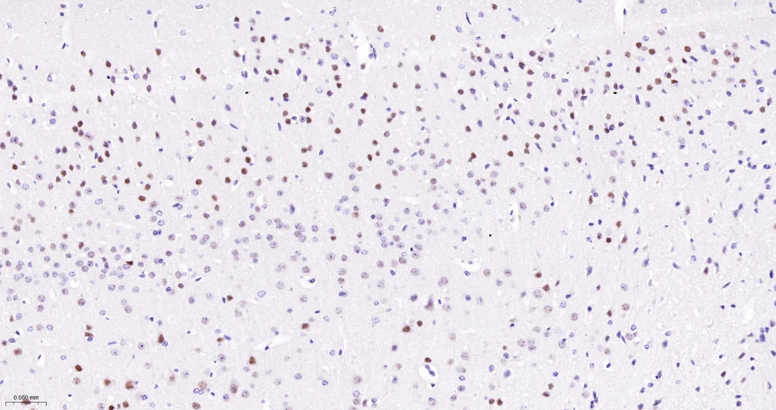 Paraformaldehyde-fixed, paraffin embedded Mouse Cerebrum; Antigen retrieval by boiling in sodium citrate buffer (pH6.0) for 15 min; The section was incubated with Cyclin H Monoclonal Antibody, Unconjugated (bsm-61446R) at 1:200 overnight at 4°C, followed by conjugation to the bs-0295G-HRP and DAB (C-0010) staining.