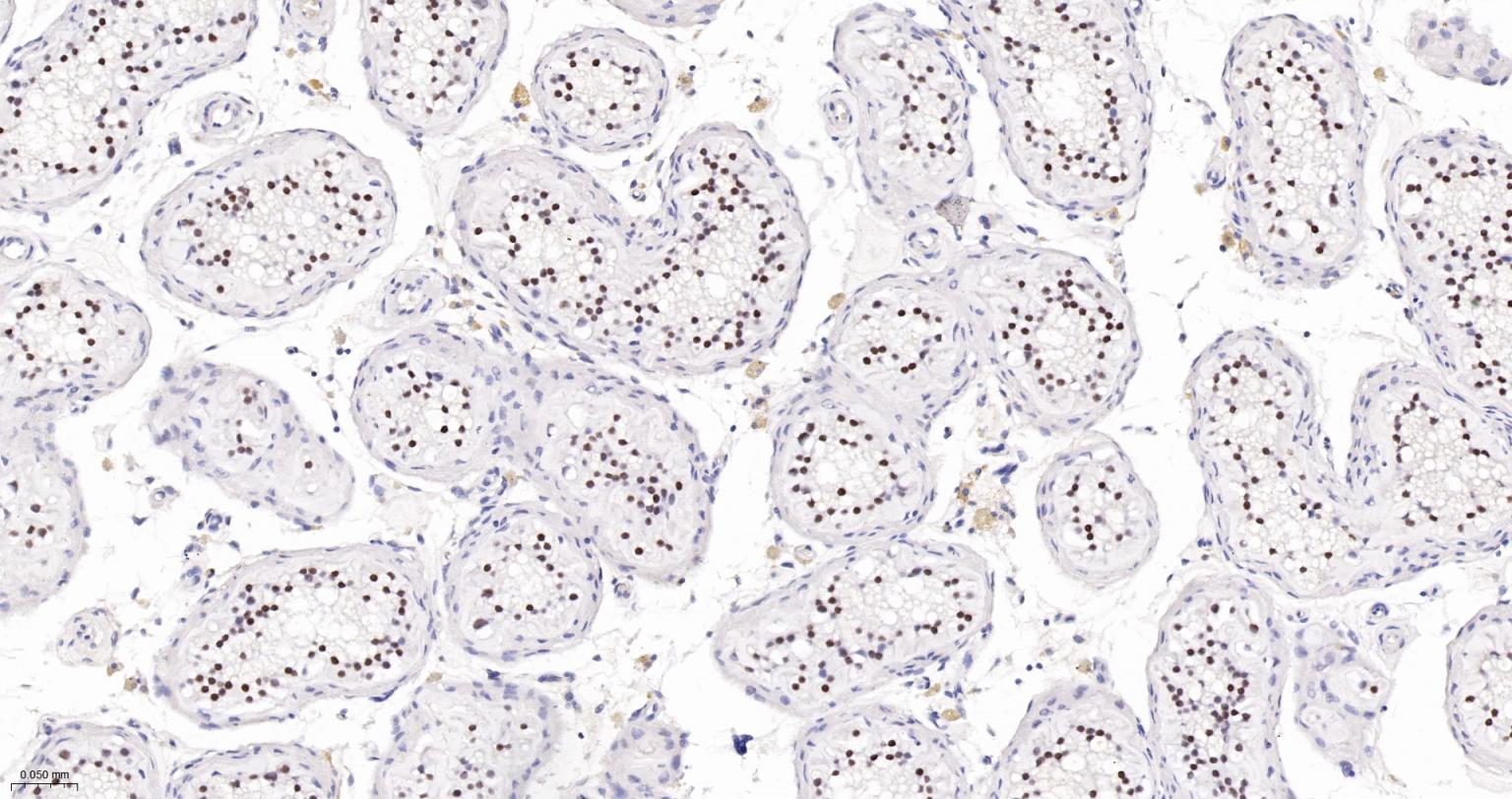 Paraformaldehyde-fixed, paraffin embedded Human Testicles; Antigen retrieval by boiling in sodium citrate buffer (pH6.0) for 15 min; The section was incubated with Cyclin H Monoclonal Antibody, Unconjugated (bsm-61446R) at 1:200 overnight at 4°C, followed by conjugation to the bs-0295G-HRP and DAB (C-0010) staining.
