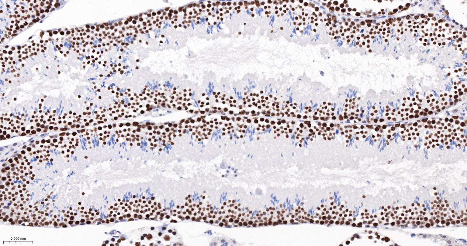 Paraformaldehyde-fixed, paraffin embedded Mouse Testicles; Antigen retrieval by boiling in sodium citrate buffer (pH6.0) for 15 min; The section was incubated with Cyclin H Monoclonal Antibody, Unconjugated (bsm-61446R) at 1:200 overnight at 4°C, followed by conjugation to the bs-0295G-HRP and DAB (C-0010) staining.